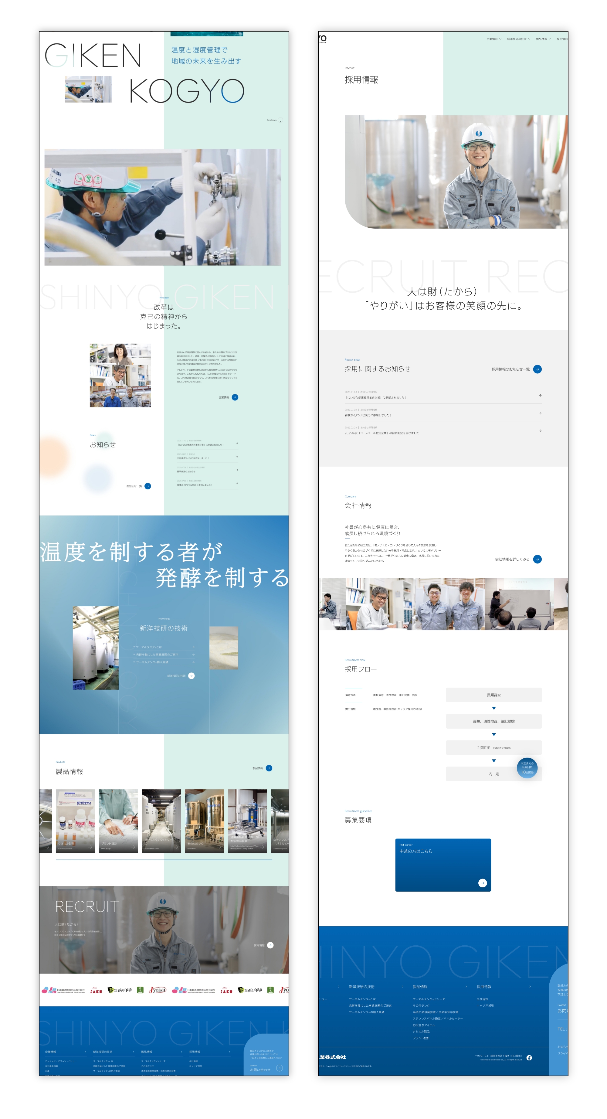 新洋技研工業様のルーツである「発酵を軸にした事業展開」や「人を笑顔にする技術」というビジョンを中心に、Webサイト全体を再設計しました。技術紹介ページでは、装置の仕様だけでなく「何が変わるか」「どんな価値を提供できるか」をビジュアルと文章で明確化しました。納入実績ページでは、酒蔵向けから発酵食品・その他業界へ広がる導入ストーリーを整理し、「食品加工装置のプロフェッショナル」であることを印象づけました。また、ミッション・ビジョン・SDGsへの取り組みといったコーポレート要素も統合し、装置メーカーとしての信頼性・企業としての姿勢を強く打ち出しました。